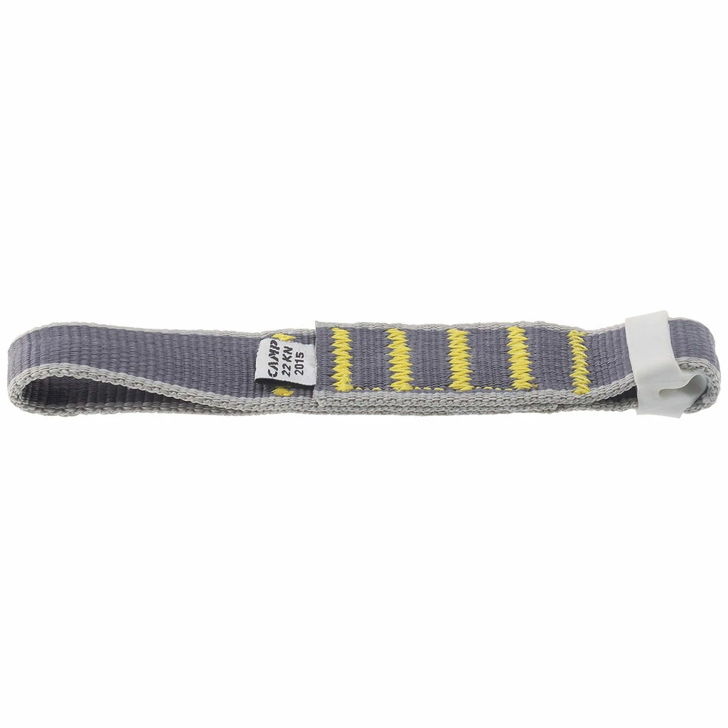 The CAMP Sling Stop Wide KS is a 25 mm polyester dogbone with a variable width design that is thick and stiff in the middle and tapered at the ends for a profiled connection with the carabiners. The structure is designed for high-end sport climbing where they are easy to grab and handle and the wider cross section prevent twisting to keep the draws in their proper orientation, ready for fast and furious clipping on the sharp end. The rope-end opening is equipped with CAMP’s proprietary Karstop Evo carabiner retainer, a strong urethane rubber keeper that fits snugly to the carabiner to prevent it from shifting.