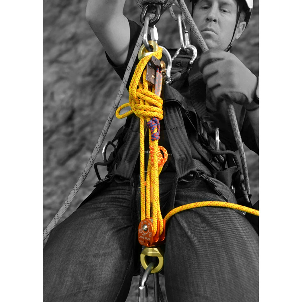 The Rock Exotica AZTEK system has become the ultimate Personal Mechanical Advantage kit that can be configured as a 5:1, or 4:1 with a re-direct by just rotating the system. The AZTEK can be used as a pick off, adjustable directional, high directional guyline, high angle attendant tether, high angle litter scoop, load release hitch and much more. Each pulley is color coded to match with a corresponding prusik for quick identification. The AZTEK pulleys are machined from solid aluminum, feature swivel connection points, and utilize high efficiency bearings.