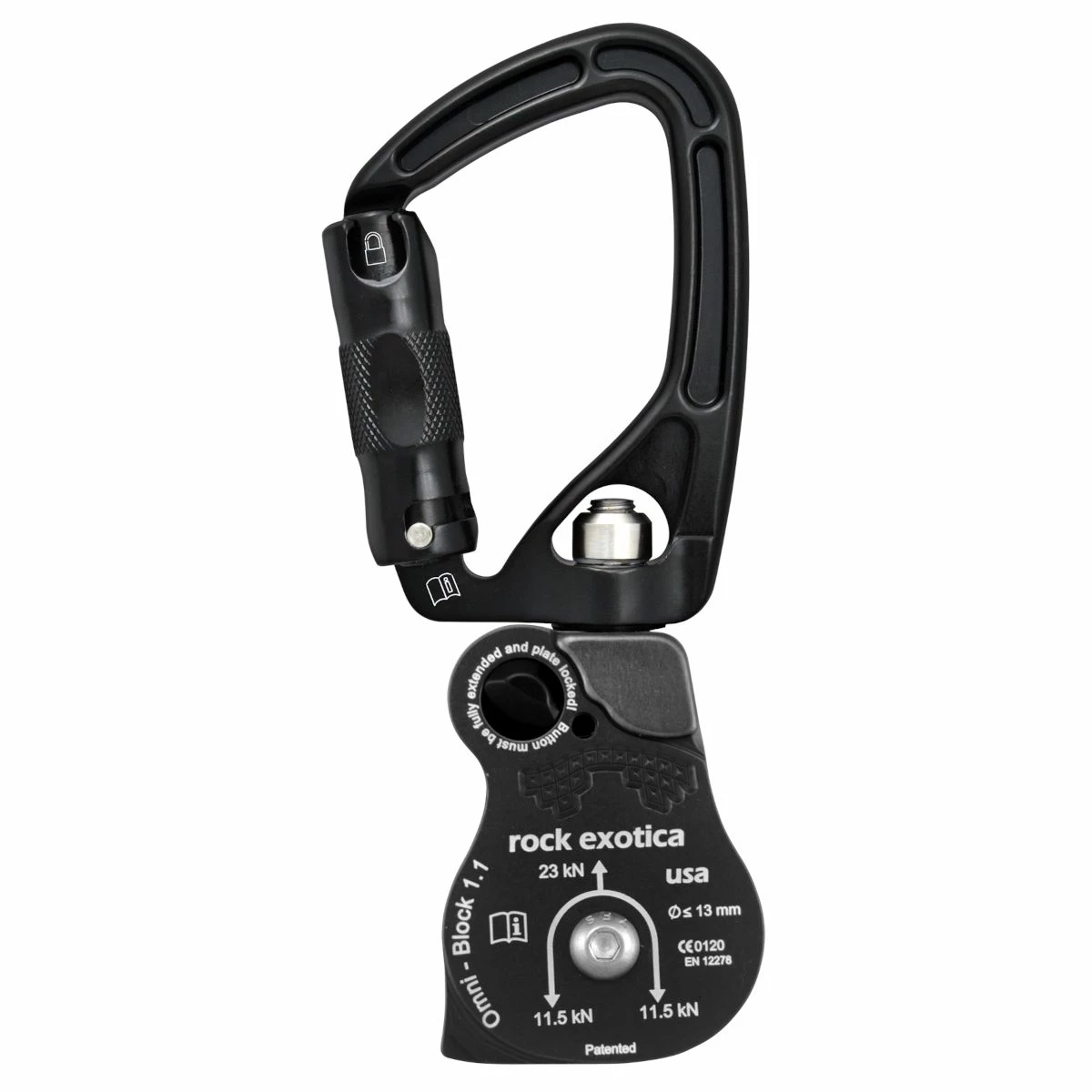 The Rock Exotica Omni-Block 1.1 SwivaBiner combines a swiveling carabiner and pulley into one tool, and incorporates a unique sideplate that opens while the pulley is still attached to the anchor.