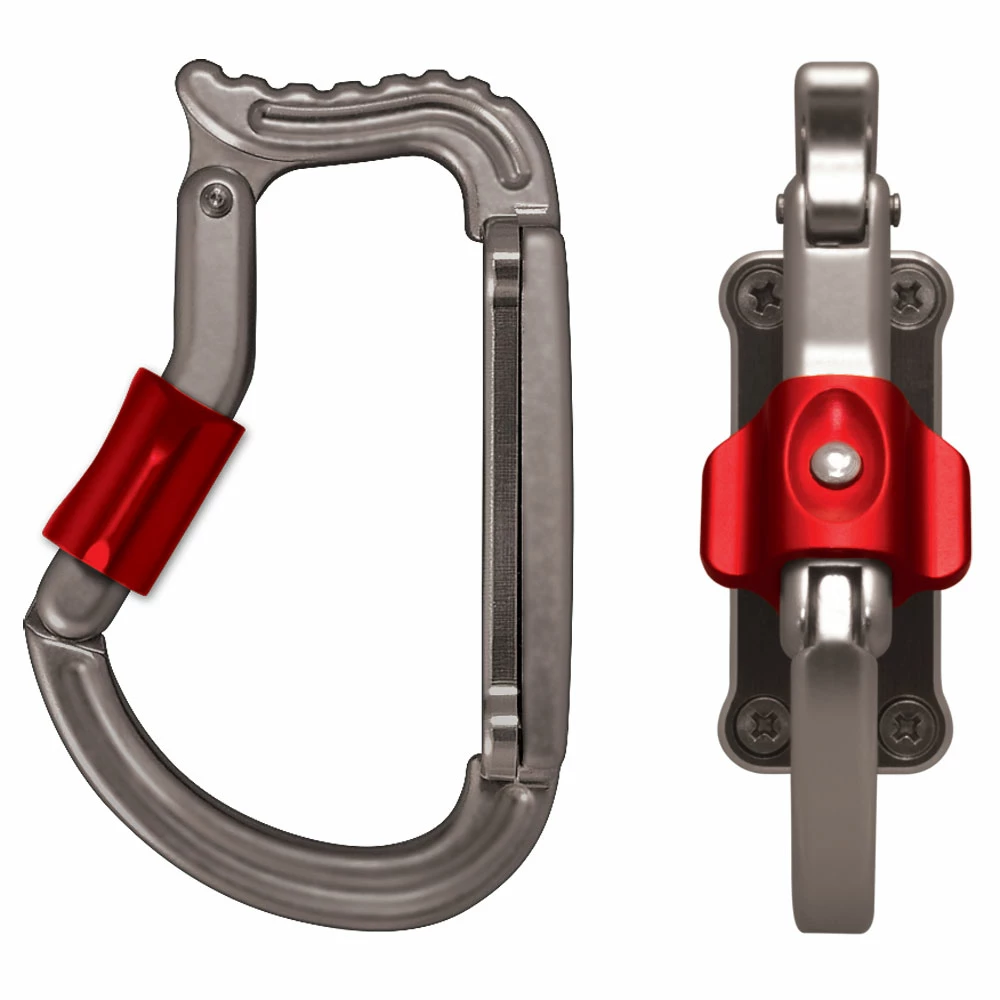 The Rock Exotica transPorter is designed as a harness “tool-holder” made for ease of use and security. Designed for rigging, industrial work, and big wall climbing, and other situations where you just cannot afford to drop a tool, this is the most bombproof racking ‘biner available. The manual locking gate is a dual push-button design that you can lock if desired to prevent inadvertently snagging or hooking unwanted items. But you can also leave it unlocked when needed so you are able to remove tools quickly without fumbling to repetitively unlock the gate. Unique “wings” on the gate allow the user to single-handedly retrieve and sort gear, even with gloves on. The transPorter semi-permanently attaches to the harness, secured by an aluminum plate with removable screws. The wide plate and rigid frame ensure the transPorter will stay in position when used with small or large tools. Machined from solid aerospace grade aluminum.